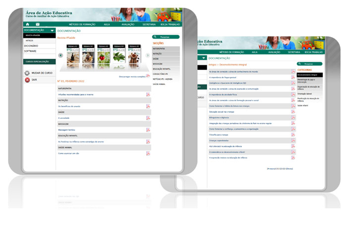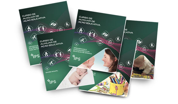 O Curso de Auxiliar de Ação Educativa é composto por cinco práticos manuais, impressos a cores, especialmente concebidos para a formação a distância (com múltiplos exemplos, quadros, gráficos e esquemas, resumos, glossários, etc.). Os textos são acompanhados por fotografias ilustrativas, muito claras e descritivas, que explicam os processos e os passos a realizar nas atividades objeto de estudo.